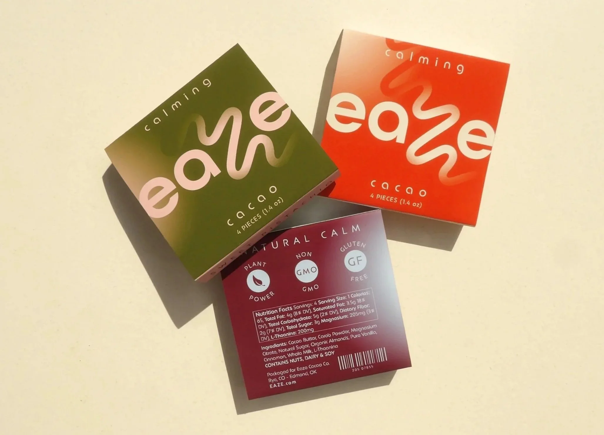 Eaze is a botanical-based chocolate offering a natural calm without harsh ingredients or overpowering side-effects. A clean, modern take on functional indulgence, this chocolate brand reimagines cacao as a calming ritual, rather than just a treat. It blends rich, antioxidant-packed chocolate with botanical ingredients known to support relaxation, balance, and emotional ease.