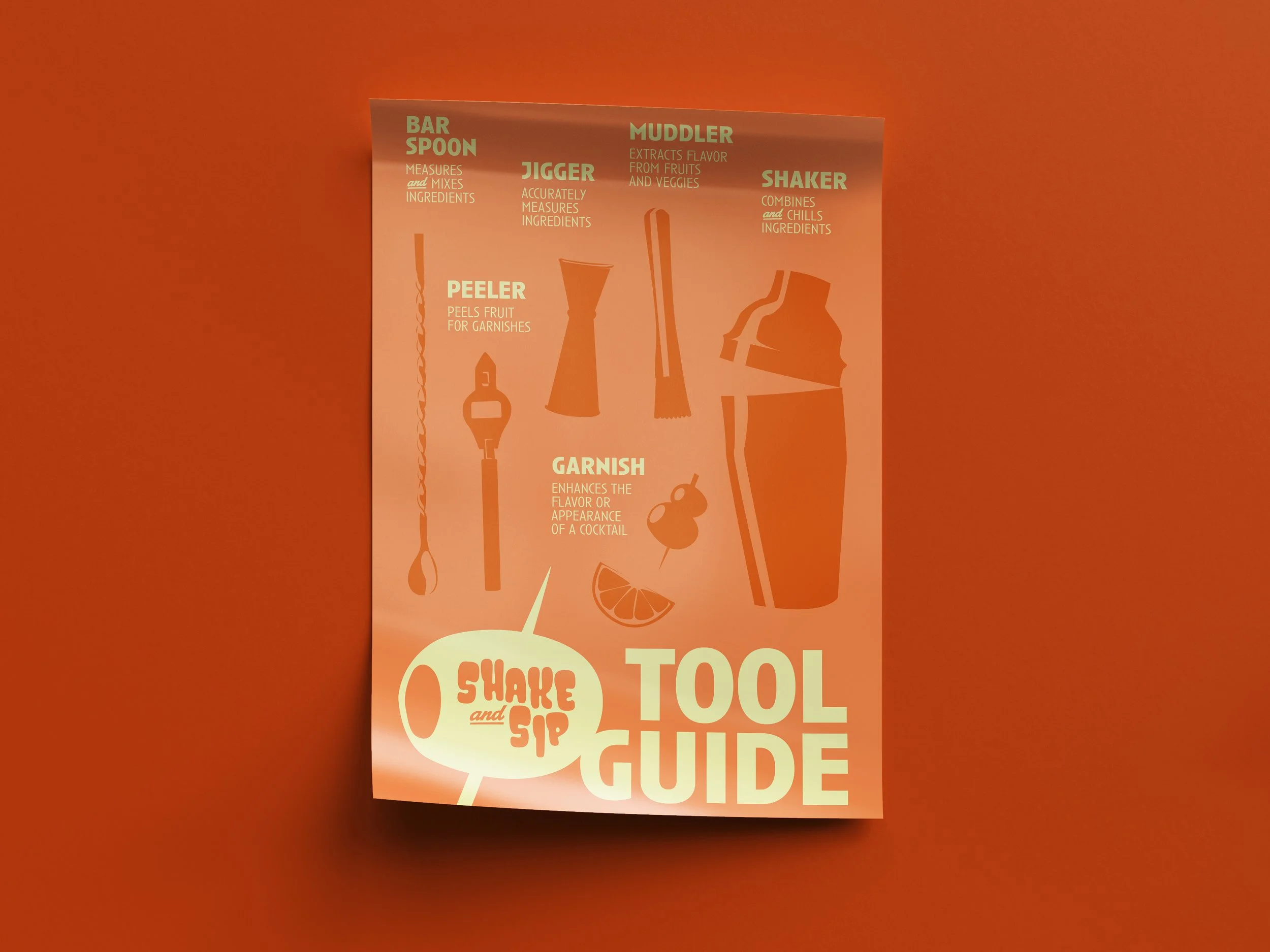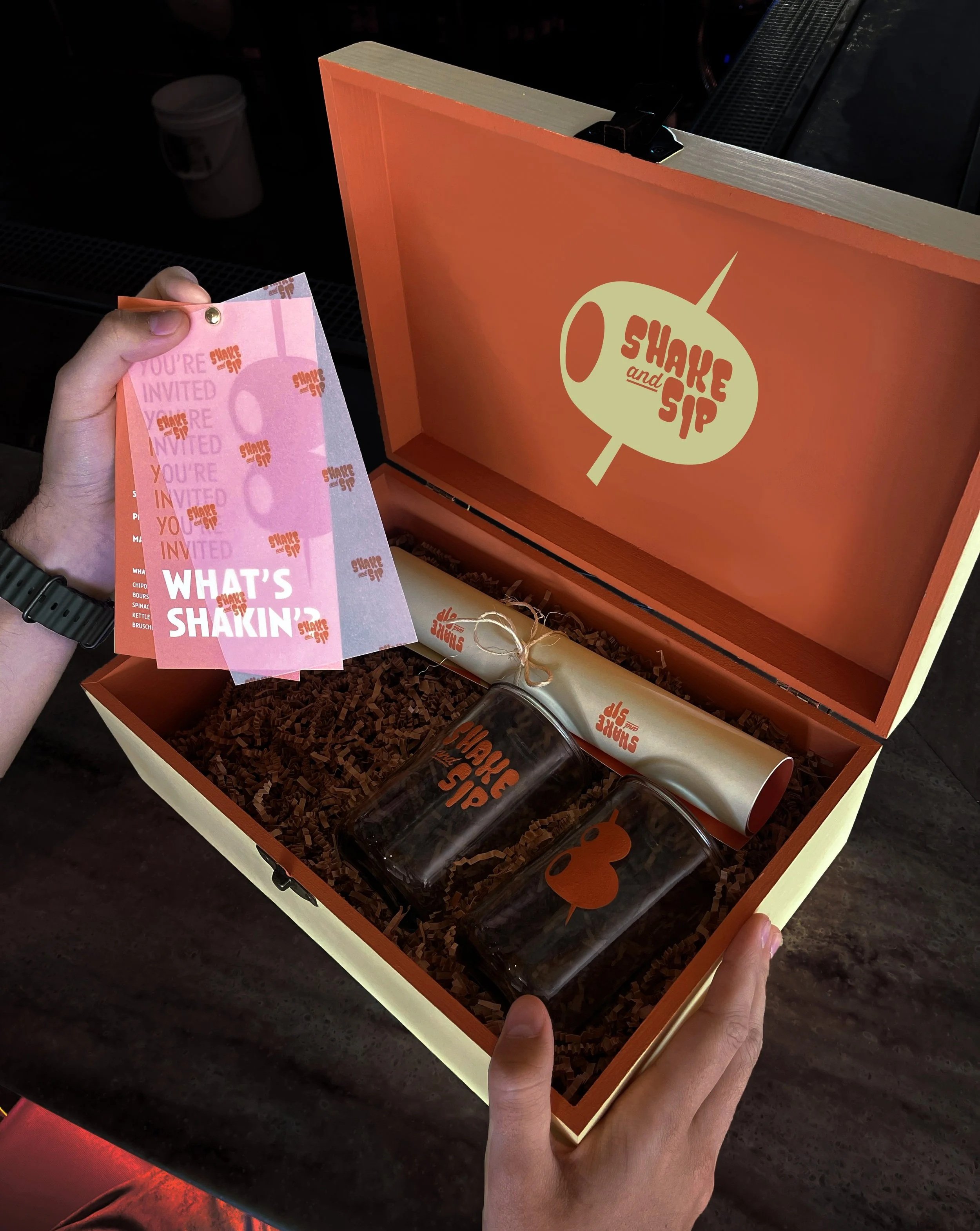 The invitation experience includes branded cocktail glasses, a formal invitation, and a poster, introducing you to a few common bar tools.